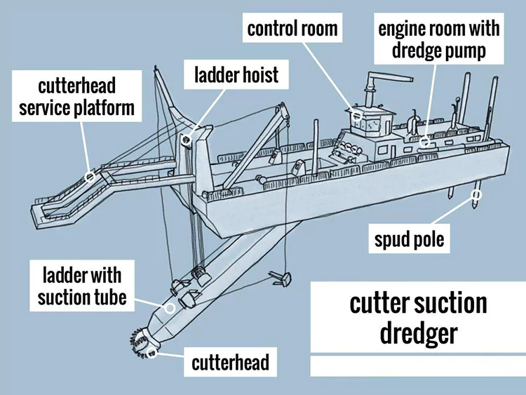 سکشن ۽ ڊسچارج سسٽم: Slurry نامزد ٿيل اسپائل واري علائقي ڏانهن سکشن هيڊ، آن بورڊ سکشن پائپ، مٽي پمپ ۽ ڊسچارج پائپ ذريعي پهچايو ويندو آهي.
